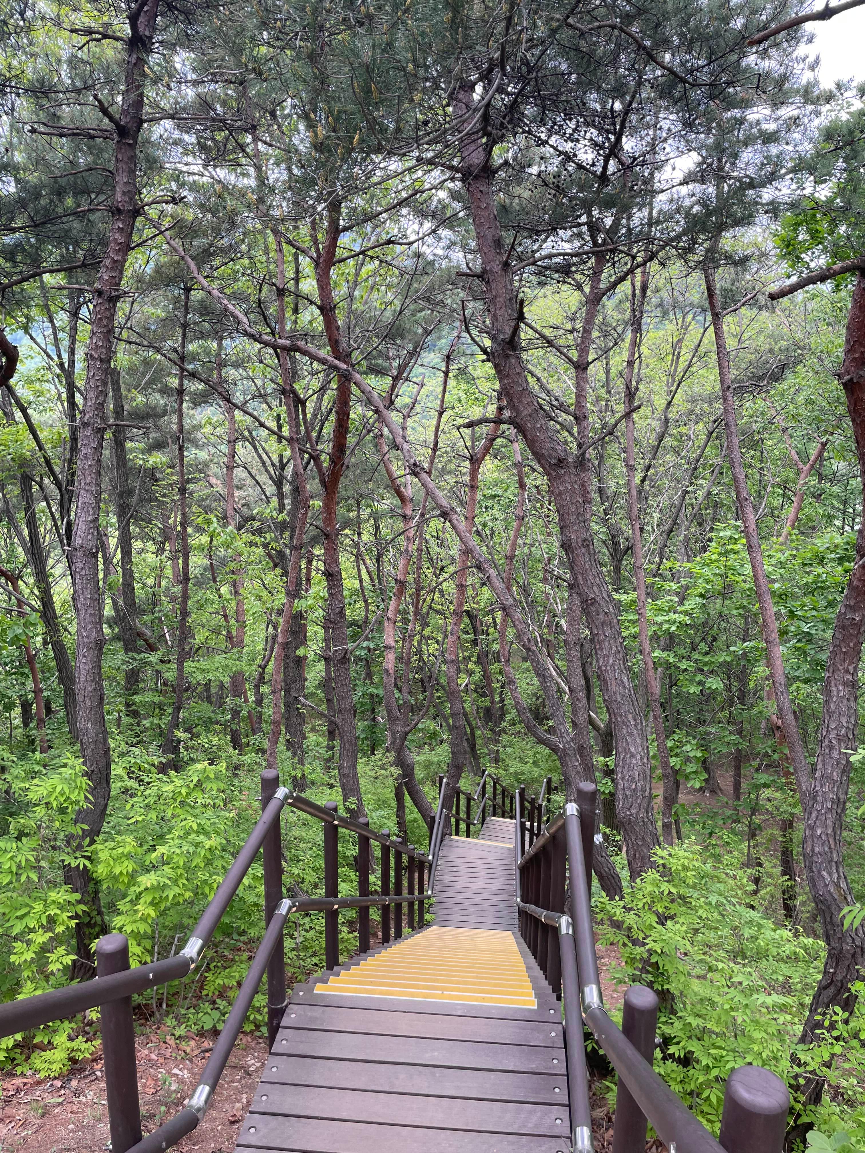 문경의 자연을 온몸으로 느끼고 싶다면 출렁다리부터 고고! 올라가는 길에 계단이 좀 많아서 힘이 들긴 하지만, 숲을 가로지르는 출렁다리 위에서 펼쳐지는 풍경은 기대했던 것 이상으로 감동을 주었습니다. 다리 아래로는 초록초록한 숲이 펼쳐져있고 멀리로는 문경 시내가 한 눈에 내려다 보입니다. 흔들리는 다리 위를 걷는 동안 오싹한 스릴과 함께 청량한 공기가 가슴을 뻥 뚫어주었습니다. 출렁다리를 건너시면 바로 옆에 숲길을 관통하는 하산길이 있습니다. 짧은 길이지만 여느 수목원 부럽지 않은 숲 산책길이었습니다.